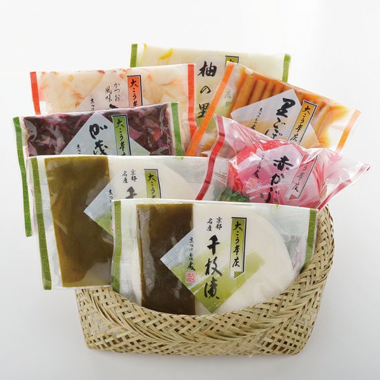 京都の冬を代表するお漬物「千枚漬(2袋)」・酸味控えめの志ば漬「加茂志ば」・大根を花鰹であっさりと漬け上げた「宝漬」・上品な柚子の風味が爽やかな「柚の里」・大こう本店自慢の誇りを持った逸品「赤かぶ」・ごぼうの醤油漬「里ごぼう」の7個を詰合せいたしました。