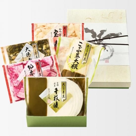 | セット内容 | 5個入 化粧箱詰 wdh30【3,369円】 千枚漬・切赤かぶ・大徳寺漬・こぶ巻大根・宝漬 |