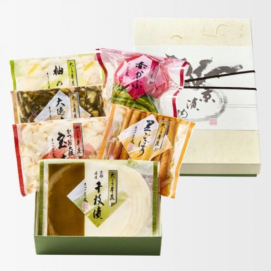 京都名産「千枚漬」や大こう自慢「赤かぶ」の季節限定商品をはじめ、名物「大徳寺漬」、「柚の里」など四季折々の京漬物の中から自信をもっておすすめする商品をセットいたしました。