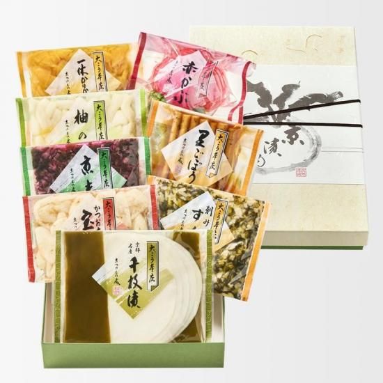 | セット内容 | 8個入 化粧箱詰 wdh50【5,448円】 千枚漬・宝漬・京志ば・柚の里・一休かりかり漬・刻みすぐき・里ごぼう・赤かぶ |